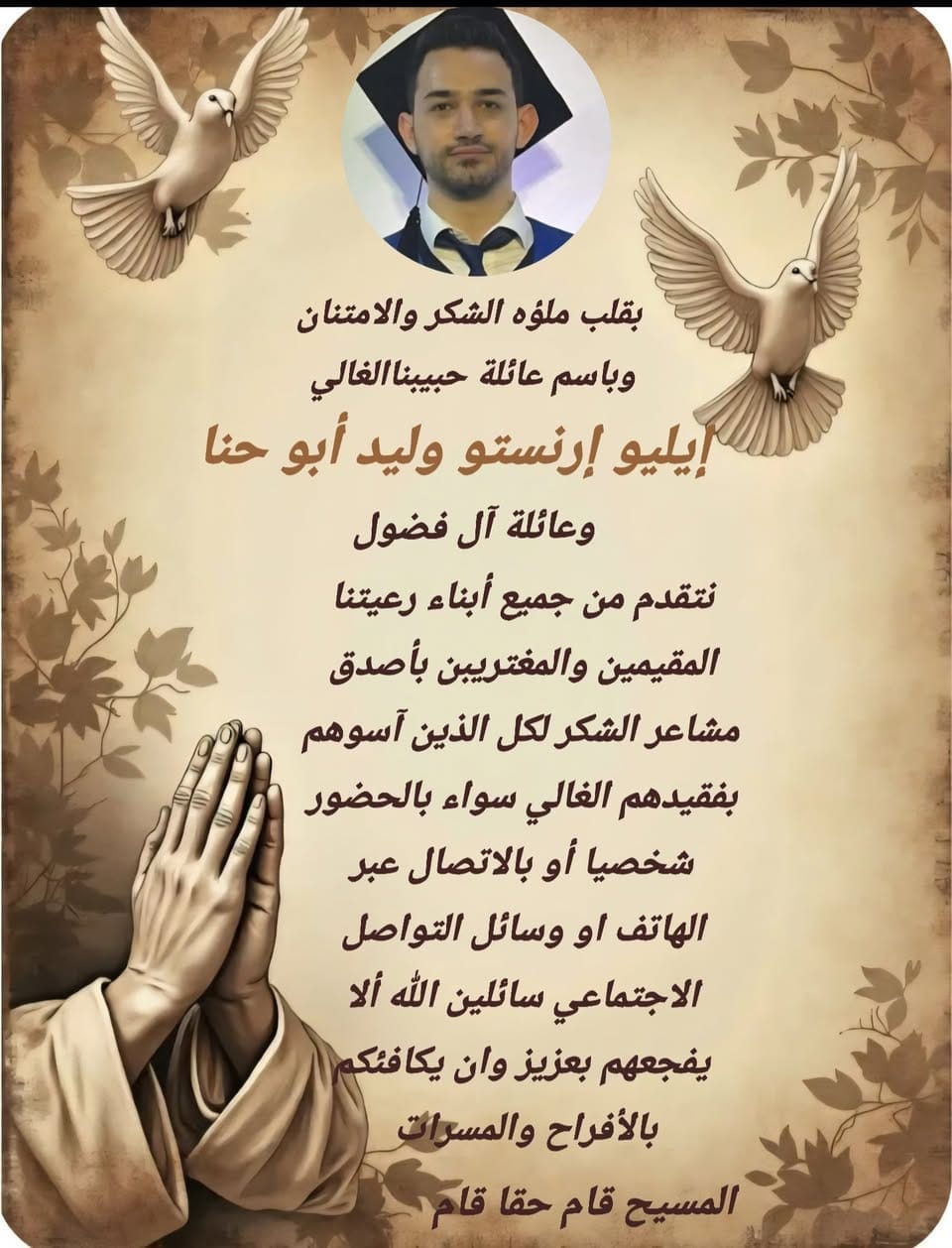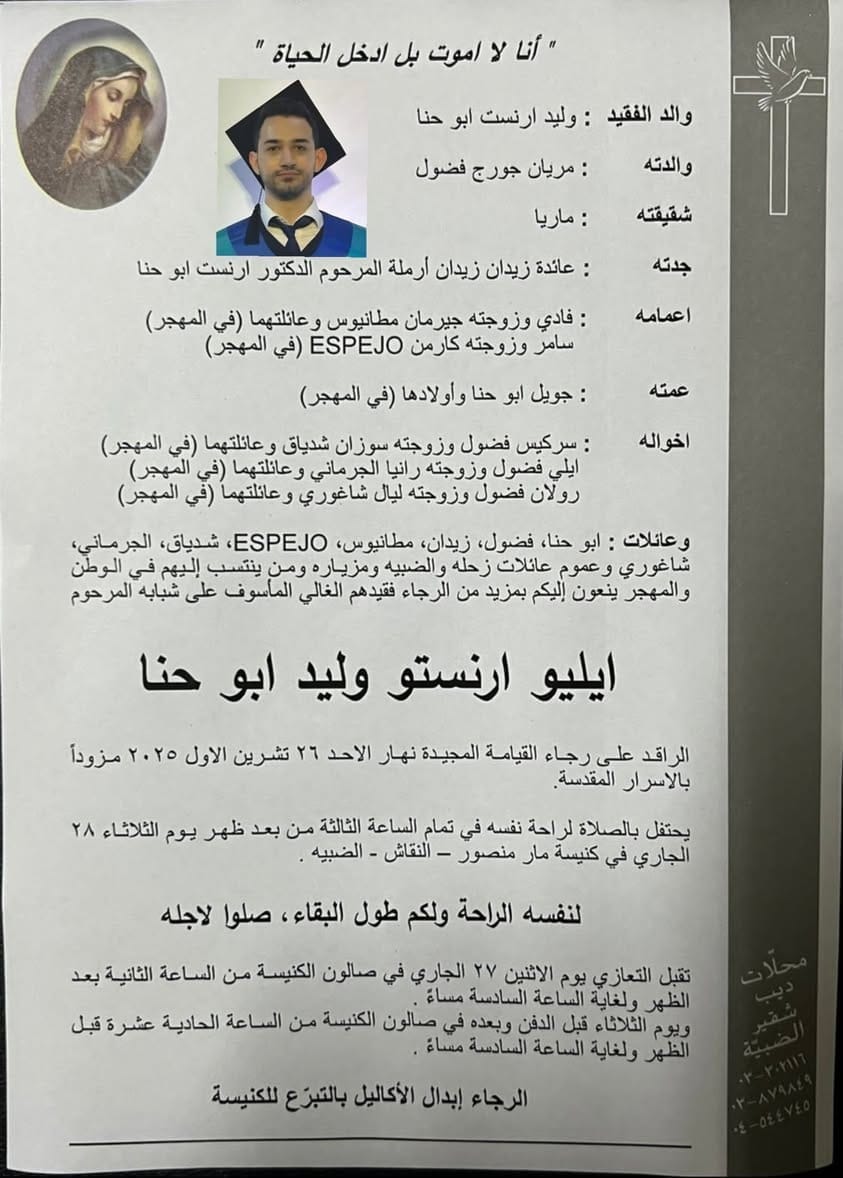 A prayer service for the repose of Elio's soul was held at 3:00PM on Tuesday, October 28th at St. Mansour Church in Naccache, Dbayeh, Lebanon.